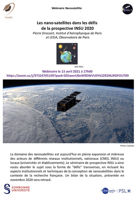 Séminaire de Pierre Drossart, le 13 avril 2021 à 17.00Les nano-satellites dans les défis de la prospective INSU 2020